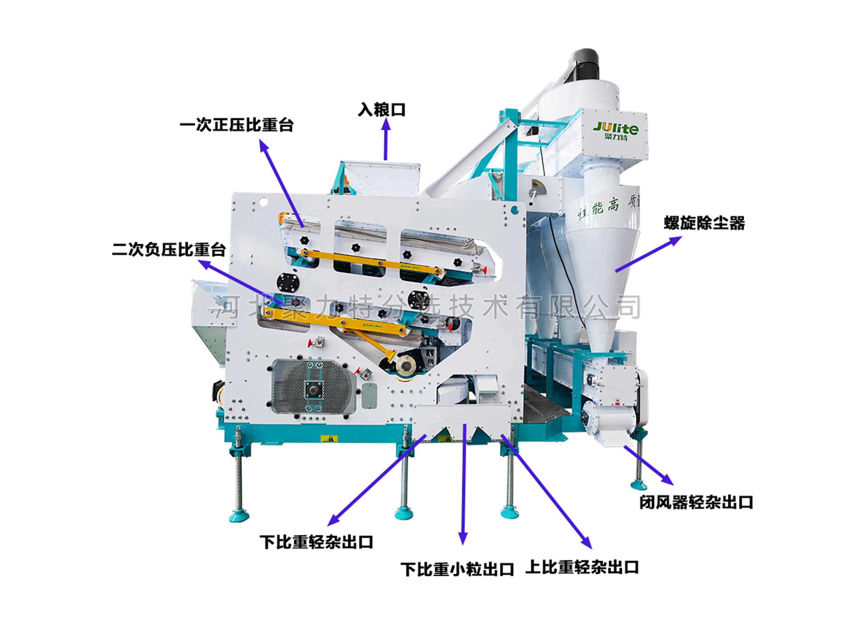 物料通過(guò)提升機(jī)經(jīng)喂入斗進(jìn)入第一道負(fù)壓比重臺(tái),通過(guò)風(fēng)選去除物料中的粉塵、糠殼等輕雜質(zhì),輕雜經(jīng)風(fēng)道、旋風(fēng)除塵器,由閉風(fēng)器排出;通過(guò)比重選有效去除物料中的秸稈、軸芯等比重較輕的雜質(zhì)。然后物料通過(guò)導(dǎo)糧機(jī)構(gòu)進(jìn)入第二道正壓比重臺(tái),通過(guò)調(diào)整風(fēng)量、擋板位置等進(jìn)行比重加工,去除物料中的碎粒、秕籽、芽粒、蟲(chóng)蛀粒、霉變粒等雜質(zhì)。最終成品從比重臺(tái)高處排出。